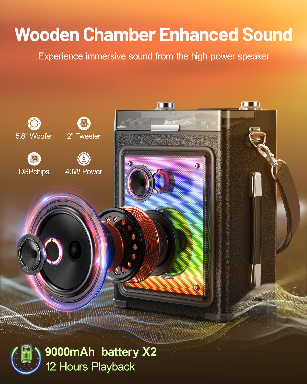 The solid wood acoustic chamber delivers richer bass and clearer vocals than plastic speakers. With a 40W high-power driver and precision-tuned EQ (adjustable bass/treble/echo), experience studio-quality sound that turns your patio into a stage.