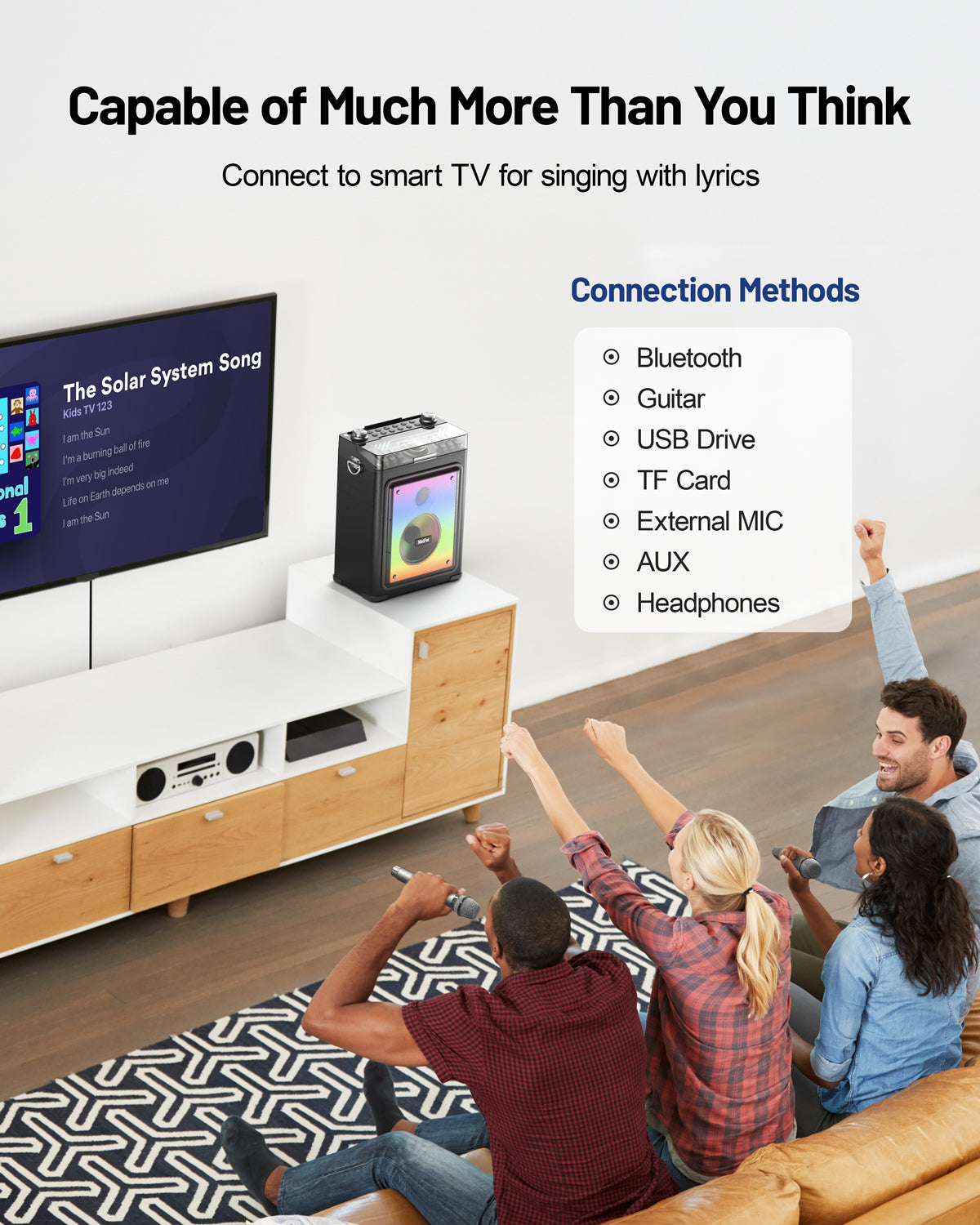 ✓ All-in-one connectivity—Bluetooth 5.3, USB, AUX, microSD